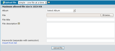 På bilden för filuppladdning, välj testalbumet från listrutan "Album". Om du inte kan välja testalbumet, så har du gjort ett misstag när du satte upp uppladdningsbehörigheterna